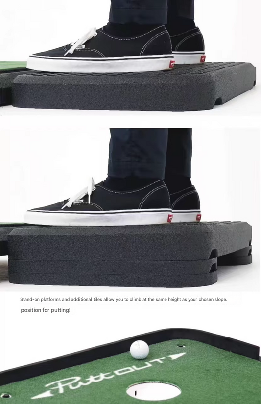 The new PuttOUT AirBreak golf club golf carpet putting training has an adjustable incline