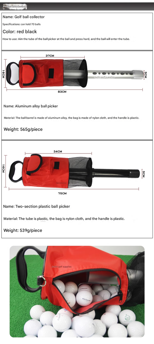 Golf ball picker, aluminum alloy ball barrel, two-stage plastic ball picker, and court supplies can hold 70 pieces with a large capacity